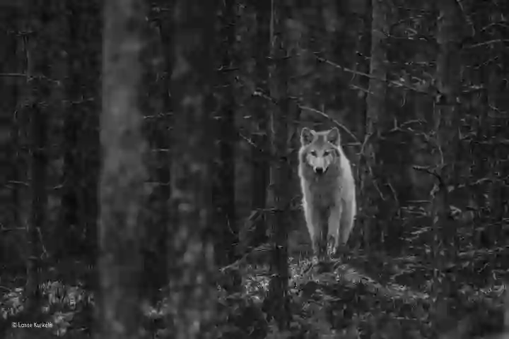 芬兰摄影师拉斯·库尔克拉拍摄的这张狼是相当不错的环境肖像作品,白色的狼和黑色的森林之间的反差非常有趣。