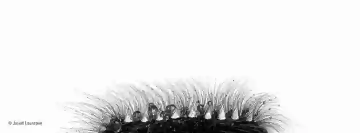 在热带夏季的雨后,劳恩施泰因遇到了这只长毛上满是晶莹水珠的带蛾幼虫。他用大逆光点亮了背景,让虫体处于暗调当中,光线穿过长毛和水珠,更显雨后的动态。这样的想法非常妙。