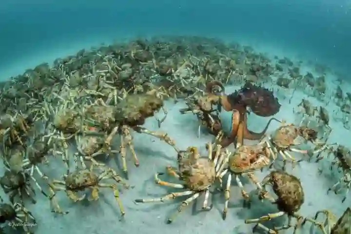 画面里的那只章鱼,不是在代表克苏鲁克总传教。画面中的蜘蛛蟹在澳大利亚的珊瑚礁区域出现了反常的集群。蜘蛛蟹是个头巨大的毛利蛸的食物,这只大章鱼简直像进了糖厂的小朋友一样兴奋,迅速地选定了自己的猎物。