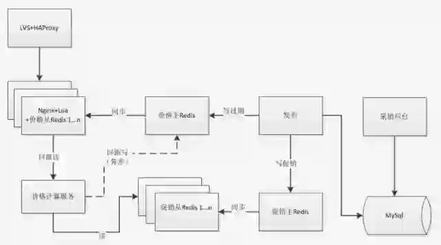 1)写逻辑流程:当采销在后端调整价格或建立促销时,同步写入 MySQL 数据库,然后通过异步任务更新促销主 Redis 数据,并同时更新价格主 Redis 的过期时间戳,通过 Redis 自身复制机制,将数据传播到从节点。2)读逻辑流程:当用户在前端浏览商品列表、详情等页面时,异步访问价格实时服务,此时内嵌 Nginx 的 Lua 程序直接读取本地 Redis(从)中的价格数据,无过期则直接返回用户;若过期或不存在,则回源访问价格实时计算服务,即刻返回最新价格给用户。3)回源写逻辑:价格实时计算服务读取促销主 Redis,在返回最新价格给用户的同时,异步写价格主 Redis 集群,价格主 Redis 同步数据至前置 Nginx 节点的从 Redis 节点。