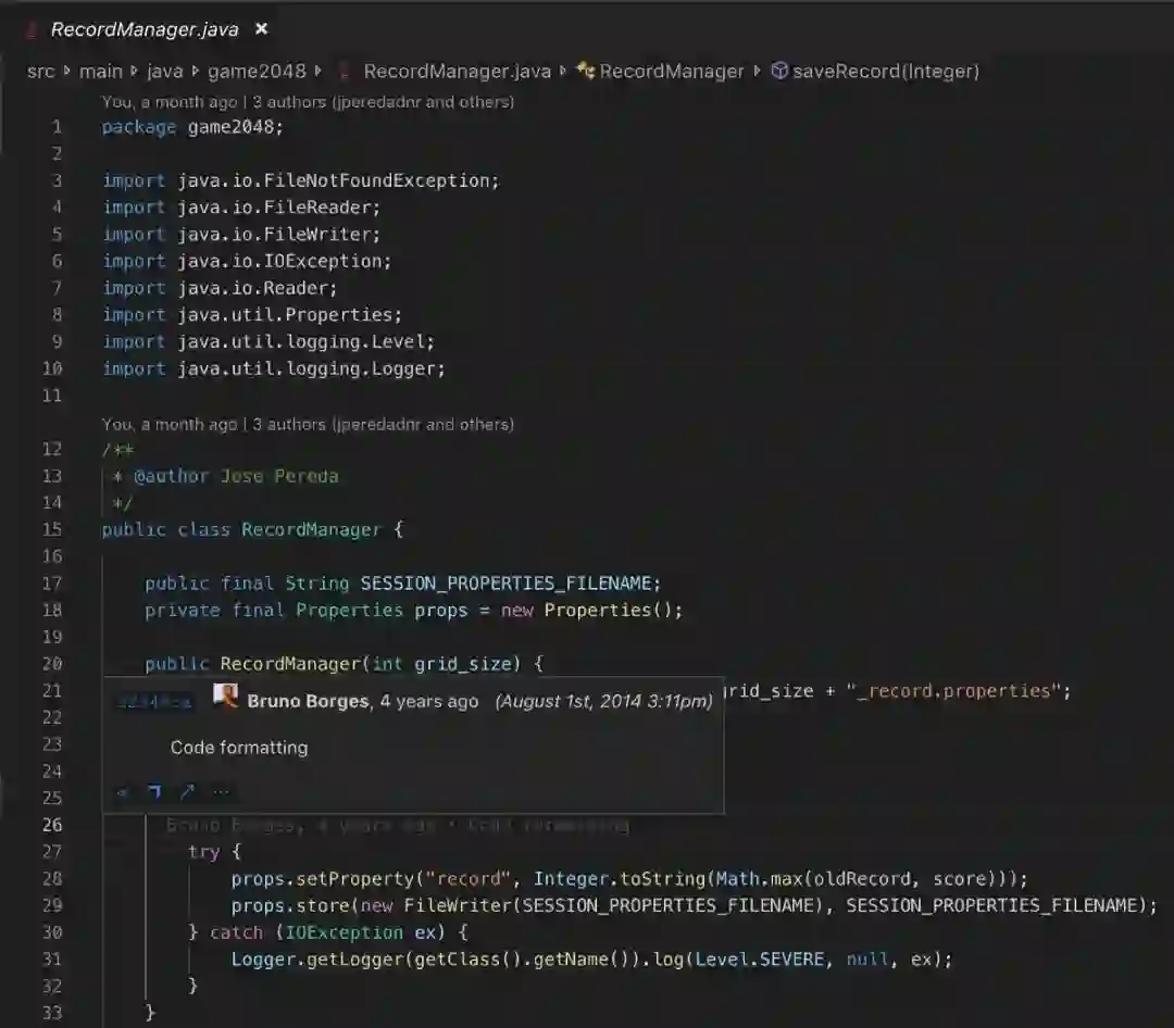 安装了 GitLens 之后,Java 类的样子将如上图所示。26行显示了修改者的历史信息。你也可以简单地将鼠标悬停在特定的行上,它将显示何人何时修改了该行代码。