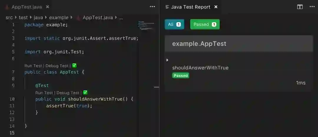 该部分的内容能够帮助你更好地运行、调试和可视化单元测试结果。此扩展添加了可单独执行的单元测试(支持 JUnit 和 TestNG )的超链接,你可以在 Visual Studio Code 中即刻查看报告,如下例所示。
