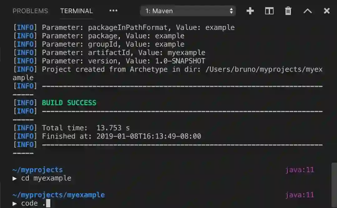 扩展程序将询问目标文件夹,项目文件夹将会自动生成到该目标文件夹中。之后会打开一个终端,你需要在该终端上输入 Maven 命令行的参数,这些都会自动引导,因此完全不必担心。