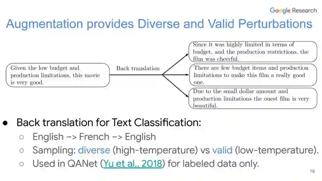 本篇文章探索了多种增广数据的方法,除了图像领域的旋转、扭曲方法等,也包括NLP领域的反向翻译(Back-translation)和TF-IDF词替换,对比它们对于半监督学习效果的影响,证明了有针对性的数据增强效果明显优于无针对性的数据增强。同时,本文章还提出了一种训练技巧——TSA“数据退火算法”,用于解决对于少量的有标签数据,模型前期快速过拟合的问题。