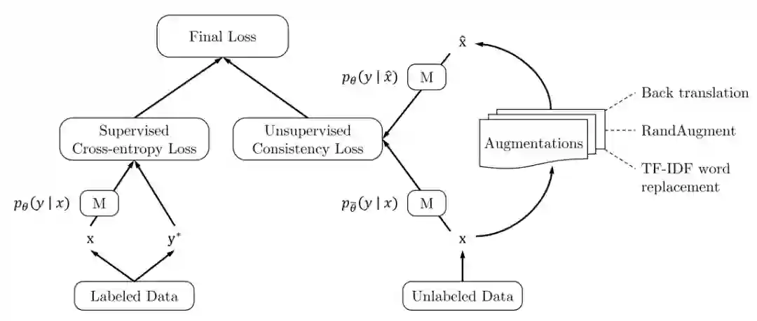 该方法思路也比较简单:对于带标签数据,直接计算分类损失;对不带标签的增广后的数据,计算模型当前对其的预测值与原始数据的预测的KL散度损失,最终两种损失按一定比例相加得到最终损失。