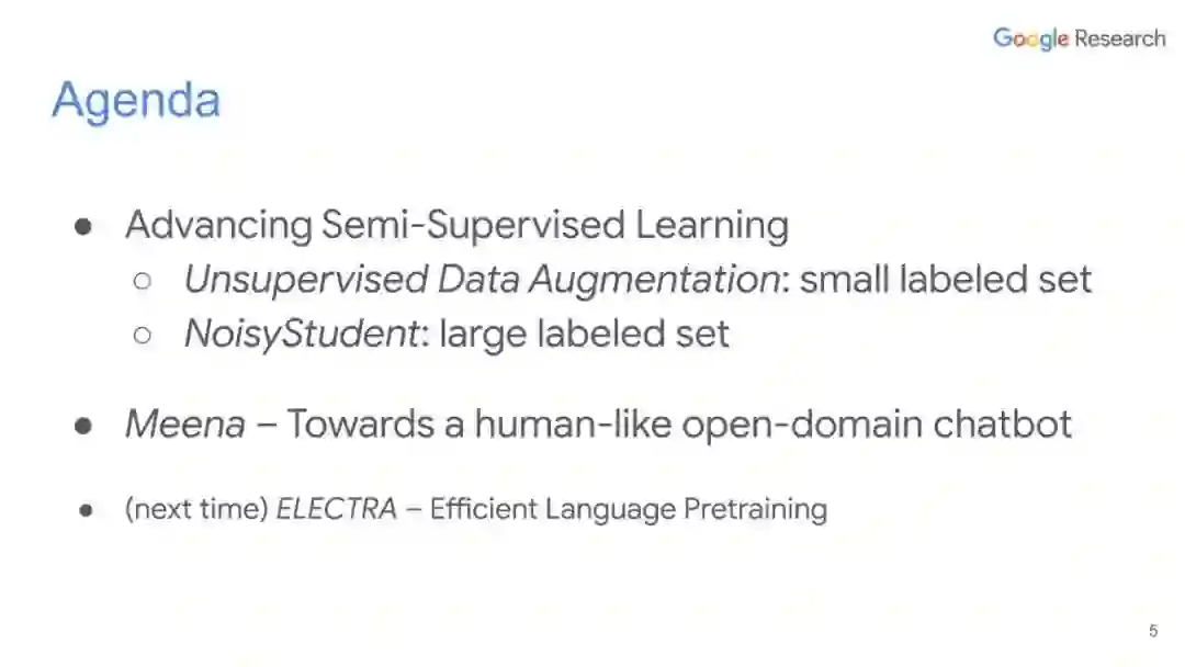 深度学习尽管取得了很大成功,但通常在小标签训练集中表现不佳。利用未标记数据改善深度学习一直是一个重要的研究方向,其中半监督学习是最有前途的方法之一。在本次演讲中,Luong博士将介绍无监督数据增强(UDA),这是我们最近的半监督学习技术,适用于语言和视觉任务。使用UDA,我们仅使用一个或两个数量级标记较少的数据即可获得最先进的性能。