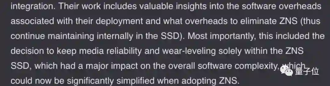 他们的工作对整体软件和部署复杂性有重大影响,他们降低了软件开销,提出了同时保证存储介质可靠、损耗均衡的关键意见,现在在采用ZNS时,可以显著简化一系列复杂性,能让ZNS更容易被使用。
