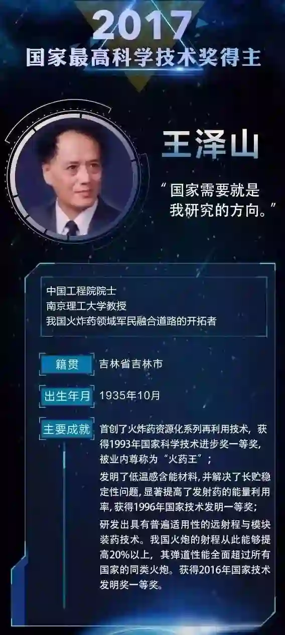 王泽山院士首创了火炸药资源化系列再利用技术,获得1993年国家科学技术进步奖一等奖,被业内尊称为“火药王”;发明了低温感含能材料,并解决了长贮稳定性问题,获得1996年国家技术发明一等奖;研发出具有普遍适用性的远射程与模块装药技术,我国火炮的射程从此能够提高20%以上,其弹道性能全面超过所有国家的同类火炮,获得2016年国家技术发明奖一等奖。