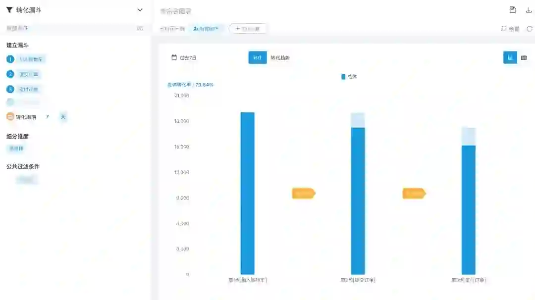 通过易观方舟,可以制定转化漏斗,清晰可视化的知道宏观漏斗与微观漏斗的转化情况,如图: