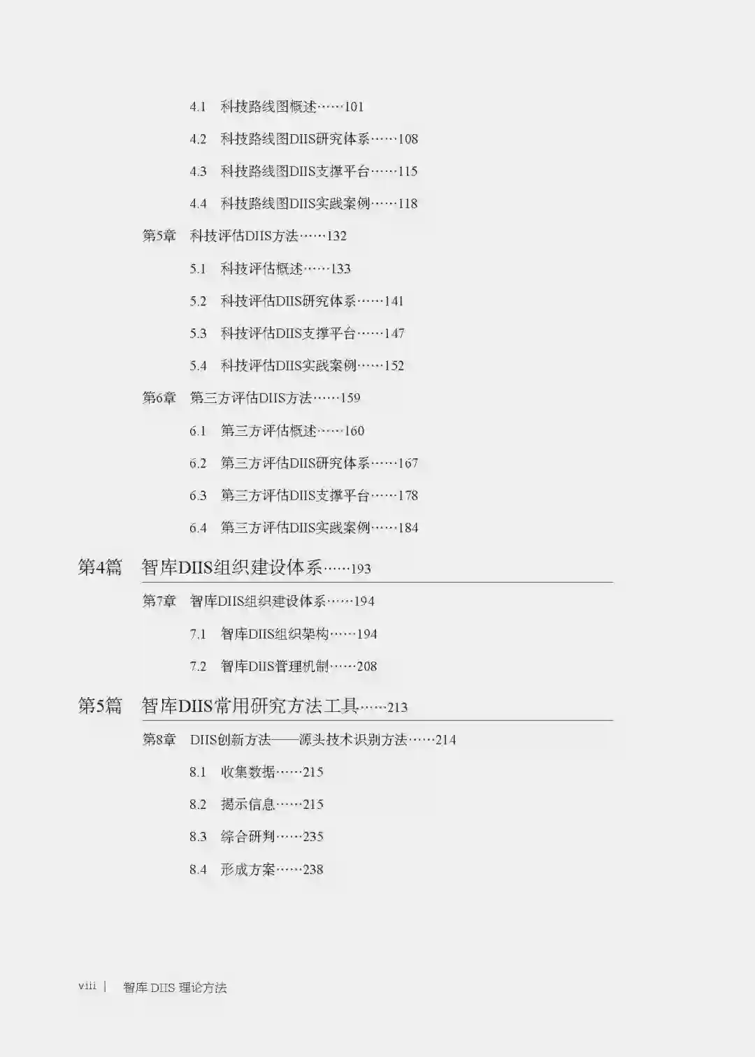 第3 篇(第4— 6 章):智库DIIS 主题研究方法体系。该篇是从中观层面论述DIIS 理论方法。该篇围绕科技路线图、科技评估和第三方评估等热点主题领域进行系统分析,并基于智库DIIS 理论方法形成相应的主题DIIS 研究体系及流程。