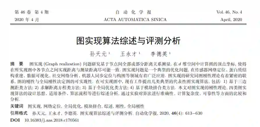 摘要: 图实现(Graph realization)问题研究基于节点间全部或部分距离关系测量, 在d维空间中计算图的顶点坐标, 使得在所实现图中各节点之间实现距离与测量距离尽可能一致.图实现问题是一个典型的优化问题, 在传感器网络定位、蛋白质结构重建、数据可视化、社交网络分析、机器人同步定位与构图等领域有着广泛应用.图实现的研究同图刚性理论有着紧密的联系, 图的刚性与全局刚性决定图的可实现性.在可实现图中, 现有工作提出几类典型的代表性图实现算法, 包括: 1)基于三边测距类方法; 2)求解距离方程类方法; 3)基于全局优化类方法; 4)基于模块拼合类方法.本文对图实现的刚性理论, 四类图实现算法的设计思想、适用条件、算法流程等进行综述分析, 通过实验对算法进行准确性、计算复杂度、可靠性等方面的比较和分析。