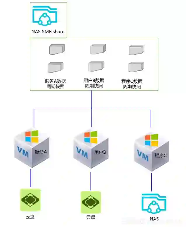 用户也可以使用第三方备份应用如Acronis Backup甚至是rsync将数据文件备份到阿里云NAS。典型的把数据周期备份到NAS的流程,如下图所示。