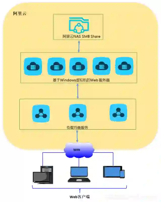 很多用户选择使用阿里云独享型Windows ECS来提供网站服务,通过将网站内容资源集中存储阿里云NAS文件系统上,IIS可以和访问本地文件系统一样访问阿里云NAS上的数据,从而帮助用户网站服务实现存储和计算分离,同时计算资源和存储资源能够按需弹性扩展, 通过阿里云负载均衡服务搭建一个弹性容错的网站架构。如图所示: