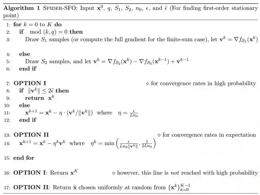 对于传统的随机梯度下降法 (SGD), 理论上对于上述问题,只能获得ɛ负 4 次幂的收敛速度。当使用方差缩减技巧 (variance reduction) [1] 之后,速度可以提升到ɛ的负 3 分之 10 次幂。而本文提出的 SPIDER 技术,可以进一步将收敛速度在理论上提升到ɛ的负 3 次幂!我们将算法展示在下图算法 1 中。可以看出算法的核心在于使用随机梯度的差分的累和估计真实梯度,与使用了归一化的步长。