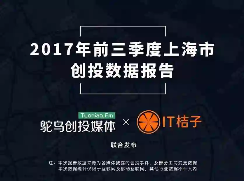 写在前面:《2017 年前三季度上海互联网及移动互联网创业投资数据研究报告》(以下简称「《报告》」)是由上海首家创业投资新媒体鸵鸟创投媒体(原名鸵鸟电台 Tuoniao.fm)和国内知名创业投资数据服务平台 IT 桔子联合发布,该报告得到了上海市科学技术委员会,上海市科技创业中心,上海科技创业新媒体联盟,上海静安区众创空间联盟等各官方组织的支持。该《报告》的基础数据来源于 IT 桔子(www.itjuzi.com),数据收录为互联网及移动互联网相关企业,仅限于这个行业的研究及趋势研判,不能代表整个上海所有行业的创业投资情况。