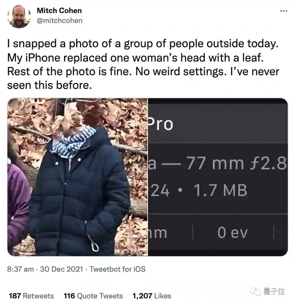 负责拍照的老哥看着自己手机里的“树叶人”,百思不得其解,于是将照片和相机参数一起丢到了推特上,并表示: