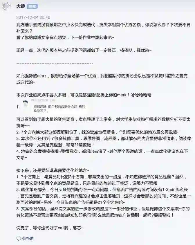 3)我们的课程确保每一份作业都会得到助教一对一的批改、点评和指导。并且为了保证批改质量,我们的助教全部来自于往期课程的优秀学员。