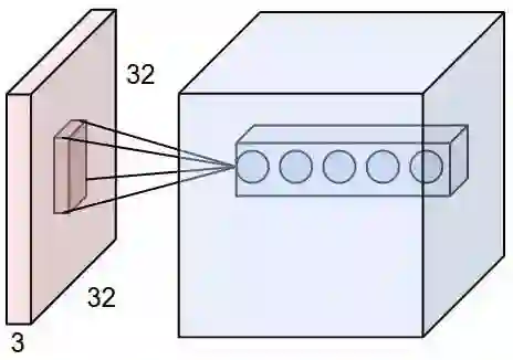 为了理解卷积层,下图展示了卷积核或滤波器(filter)将当前层级上的一个子结点张量转化为下一层神经网络上的一个长和宽都为 1,深度不限的结点矩阵。下图输入是一个 32×32×3 的张量,中间的小长方体为卷积核,一般可以为 3×3 或 5×5 等,且因为要计算乘积,那么卷积核的第三个维度必须和其处理的图像深度(即输入张量第三个维度 3)相等。最右边的矩形体的深度为 5,即前面使用了五个卷积核执行卷积操作。这五个卷积核有不同的权重,但每一个卷积层使用一个卷积核的权重是一样的,所以下图五层特征中每一层特征都是通过一个卷积核得出来的,也就是该层共享了权重。
