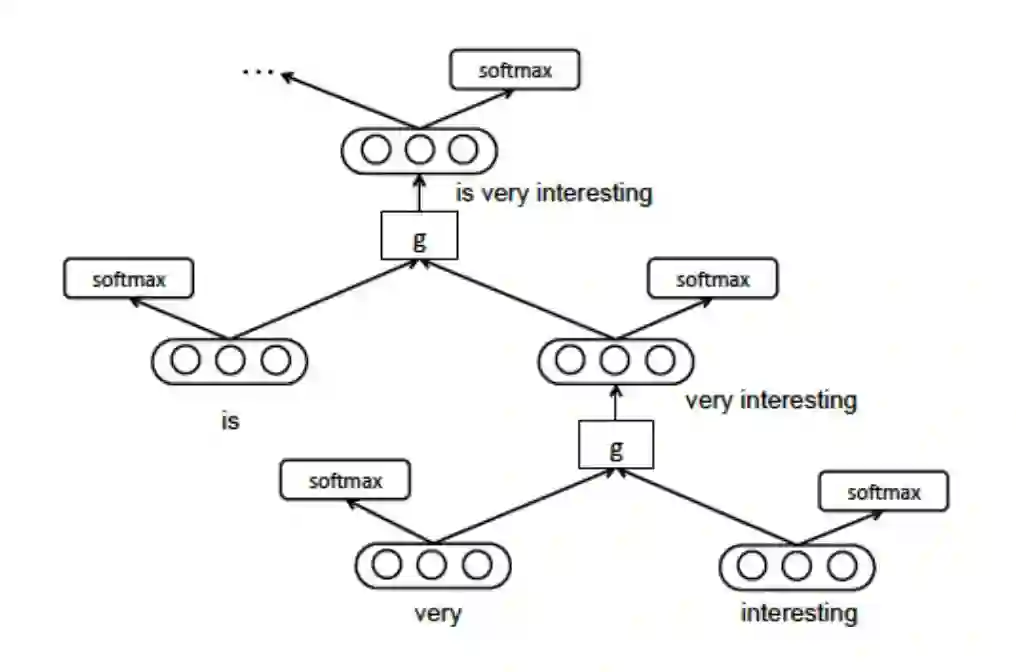 如何用稠密的向量表示短语,这是使用词向量的一个难题。在成分分析中,我们一般使用递归神经网络 (Recursive Neural Network) 来解决这个问题。递归神经网络是一种通用的模型,用来对句子进行建模。句子的语法树中的左右子节点通过一层线性神经网络结合起来,根节点的这层神经网络的参数就表示整句句子。递归神经网络能够给语法树中的所有叶子节点一个固定长度的向量表示,然后递归地给中间节点建立向量的表示。