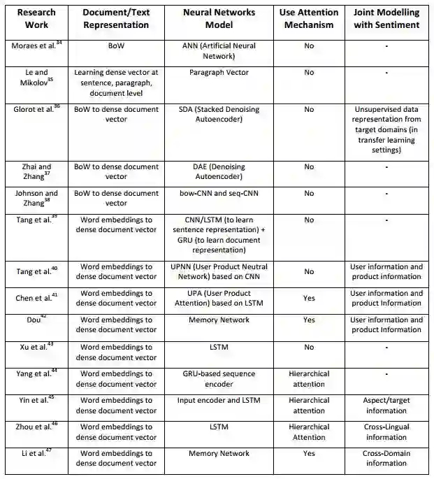 表 2:文档级情感分类的深度学习方法。