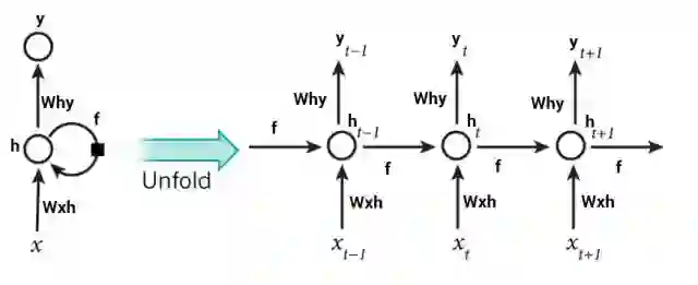在这些图表中, x_t 是时间序列上的输入,而 h_t 是循环过程中的隐藏状态。我们看到 f 重复作用于不同时间步上的隐藏状态,并将它传入下一个时间步中,这就是 RNN特有的方式。基本上,你能输入句子中的词或者甚至是像 x_t 这样的字符串中的字符,然后通过该循环神经网络它会得出一个 y_t。
