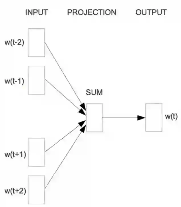 对于连续词袋模型而言,Mikolov 等人运用目标词前面和后面的 n 个词来同时预测这个词。他们称这个模型为连续的词袋(CBOW),因为它用连续空间来表示词,而且这些词的先后顺序并不重要。