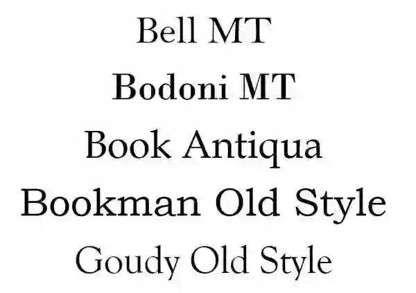 Serif (有衬线)– Bell MT, Bodoni MT, Book Antiqua, Bookman Old Style, Goudy Old Style