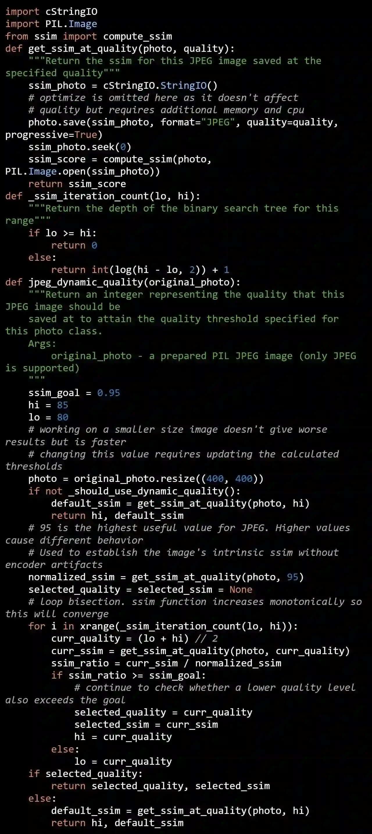 因此我们采取了第二种方法:使用二等分算法生成不同质量级别的候选图片,并使用 pyssim 计算其结构相似性 (SSIM),借此对每个候选图片的质量下降程度进行评估,直到最终确定一个可配置,但可提供一致质量标准的值。这样就可以选择性地降低图片的平均文件大小(以及平均质量),同时确保质量的降低不会被人眼所察觉。