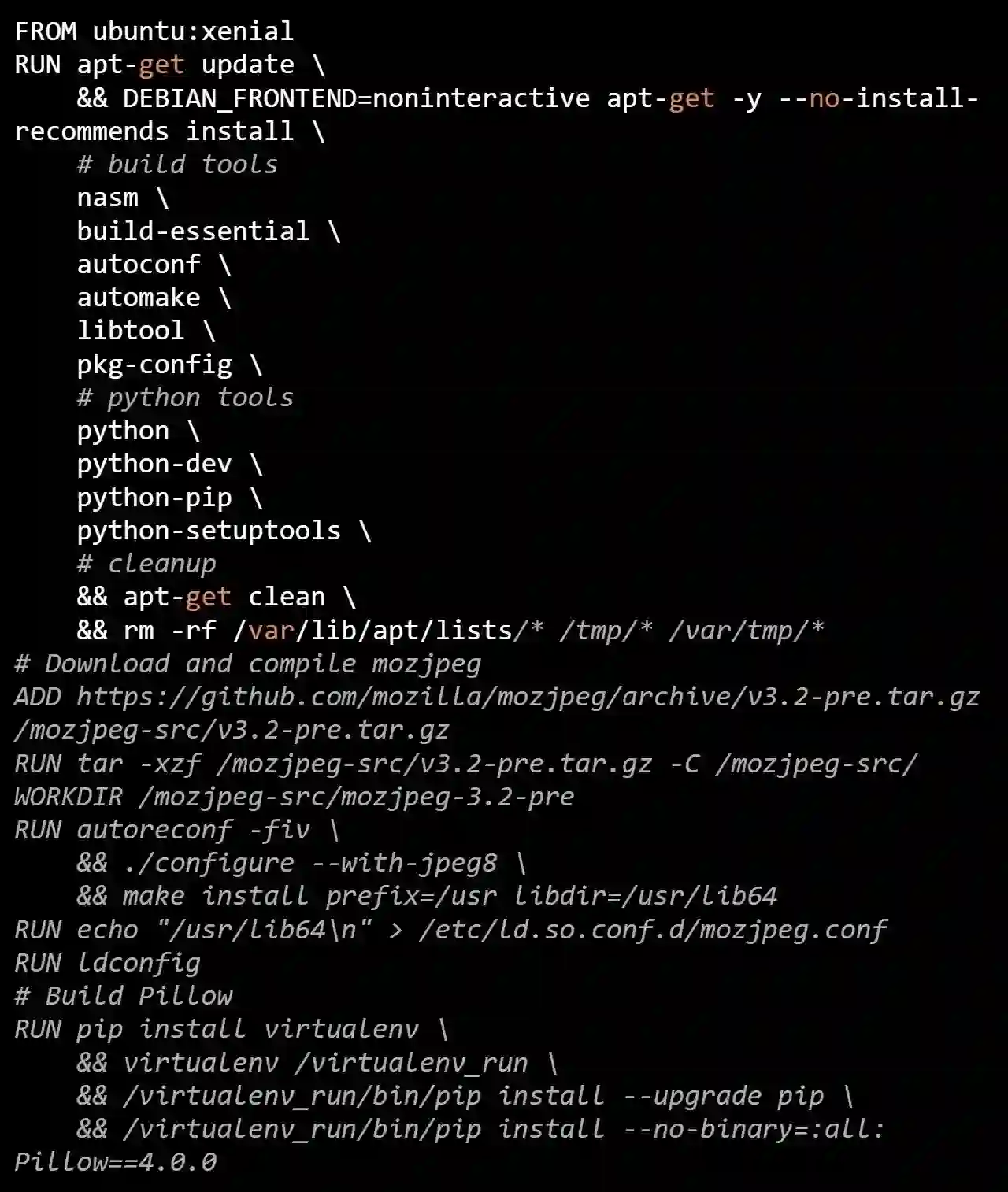 大部分 Linux 发行版默认装有 libjpeg,因此默认情况下无法在 Pillow 中使用 mozjpeg,不过好在只需简单地修改配置就能搞定。在构建 mozjpeg 时,使用 --with-jpeg8 标记,并确保它可被 Pillow 找到并链接。如果使用了 Docker,可以使用类似下面这样的 Dockerfile: