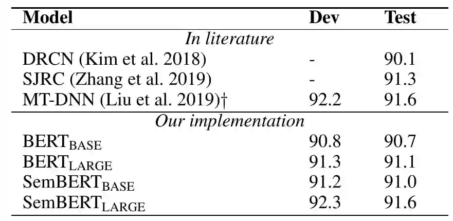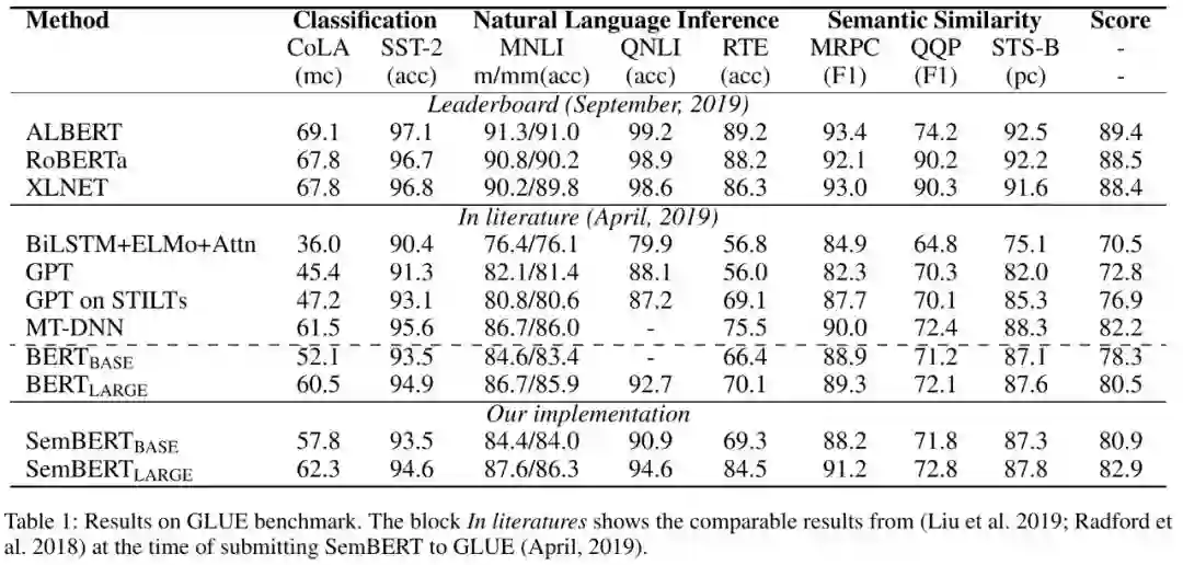 为了增强自然语言理解,本文提出通过预训练的语义角色标注模型引入显式的上下文语义标签信息,并引入一种改进的语言表示模型——语义感知 BERT (SemBERT),它能够在 BERT 为基础的骨架网络上,显性地融合上下文语义信息。SemBERT 保持了 BERT 的易用性,只需进行适应性的微调,而无需对特定任务进行大幅度的模型修改。