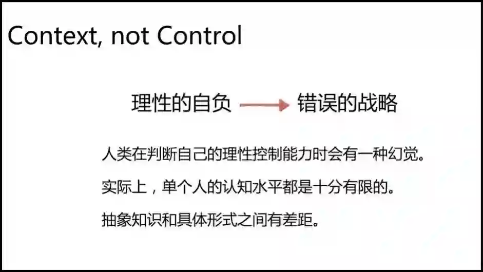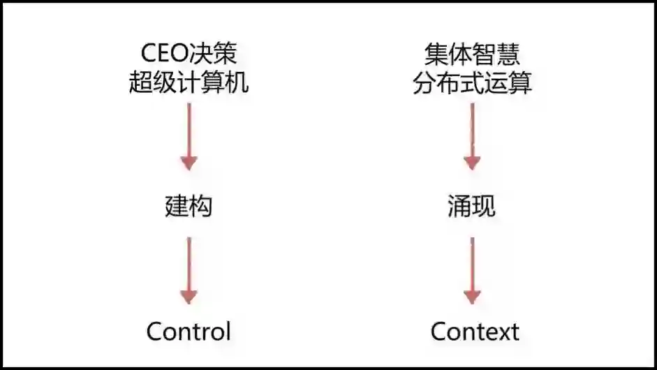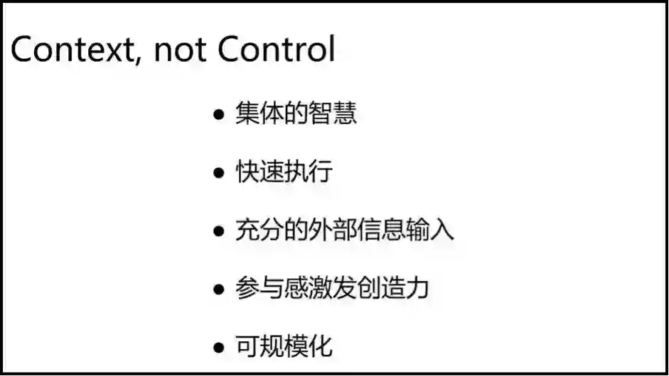 第二种,有更多的人参与决策,让更多的想法自下往上涌现出来,而不是一个从上到下的战略分解,这个过程中需要更多人基于上下文Context做出判断,而不是根据指令来执行。