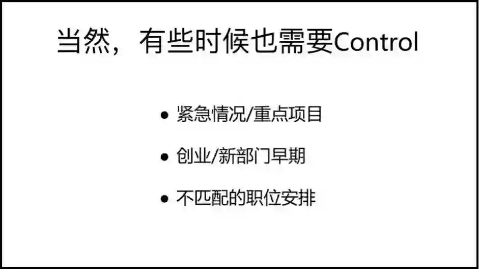 二、创新业务和新部门的早期。如果一个部门新设立,或者一个新高管上任,还没有跟公司磨合好,这个时候需要Control。创新业务早期,需要更多支持配备资源的时候,也需要CEO的统一协调,主导进展。