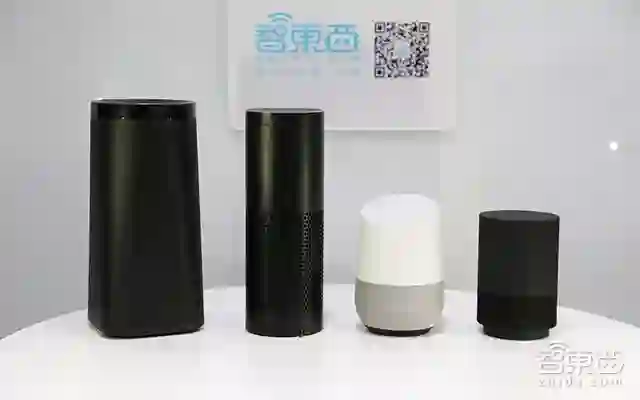 ▲从左依次为叮咚音箱A1、亚马逊Echo、Google Home、天猫精灵X1