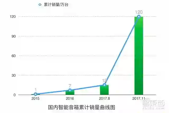 而反观国内智能音箱的发展状况,尽管在2015年(8月)就开始起步,但这一年的销量(四个月)仅有1万台,经过2016年、2017年的发展,到2017年8月刚好是智能音箱在国内2周年,而此时我们的累计销量只有15万台,不及亚马逊第一年的1/5。