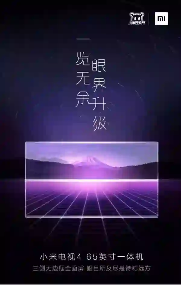 最近,小米官方公布了小米电视4 65英寸一体机的新品信息,这款产品主打“一览无余,眼界升级。”的概念,如果没有意外的话,应会在11月6日下午正式发布。目前官方并没有给出这款产品的参数信息,不过从海报上可以看出部分内容,该电视采用65英寸设计,采用超窄边设计,屏幕占比应该会比较高。