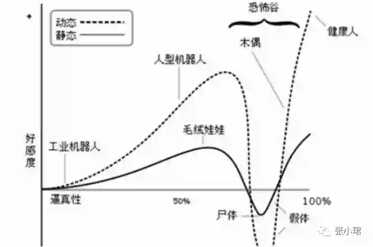 在谷底,这个大型机器人,像人又不极致,比如像僵尸,没办法做到惟妙惟肖。这个时间段人看到就发怵——它像我,又不是我,动作很怪,很瘆人——这个地方叫“恐怖谷”。再往后发展,机器人长得跟人一模一样,最后分不出是人还是机器了,人对机器人的好感又会提升。