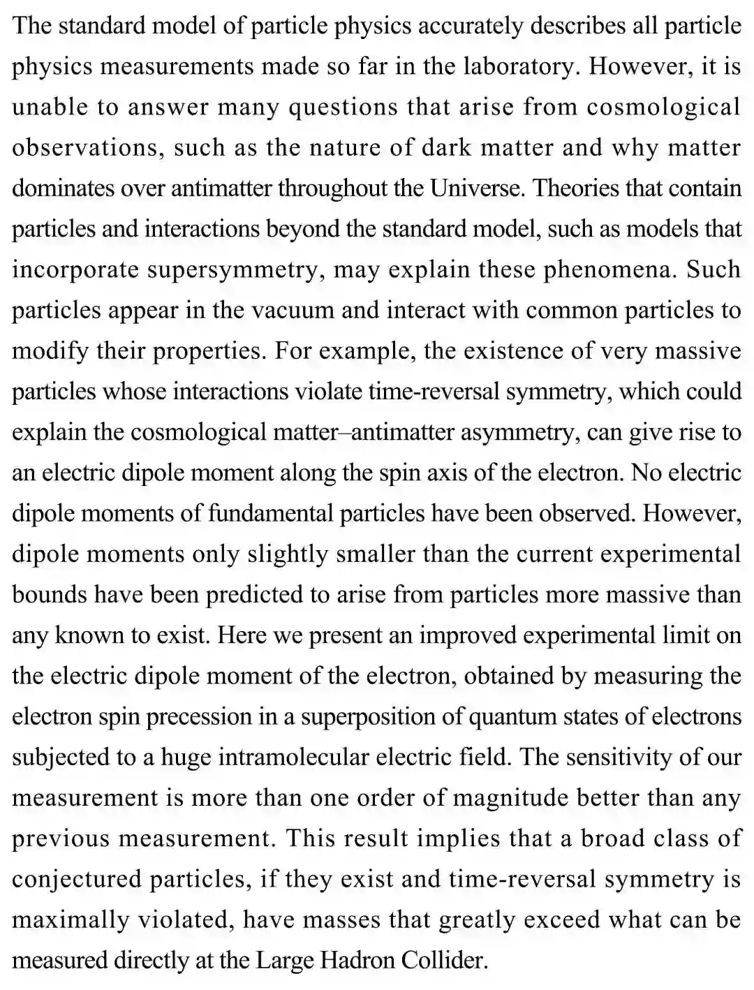 (导读 阿金)粒子物理学的标准模型可准确描述目前实验室内粒子物理学测量结果,但尚未能解释宇宙中观测到的问题。本研究通过测量电子在巨大的分子内电场下量子叠加态的电子自旋进动,改进了电子偶极矩测量的实验极限,结果表明一系列猜想的粒子的质量可能远超过大型强子对撞机的直接测量结果。
