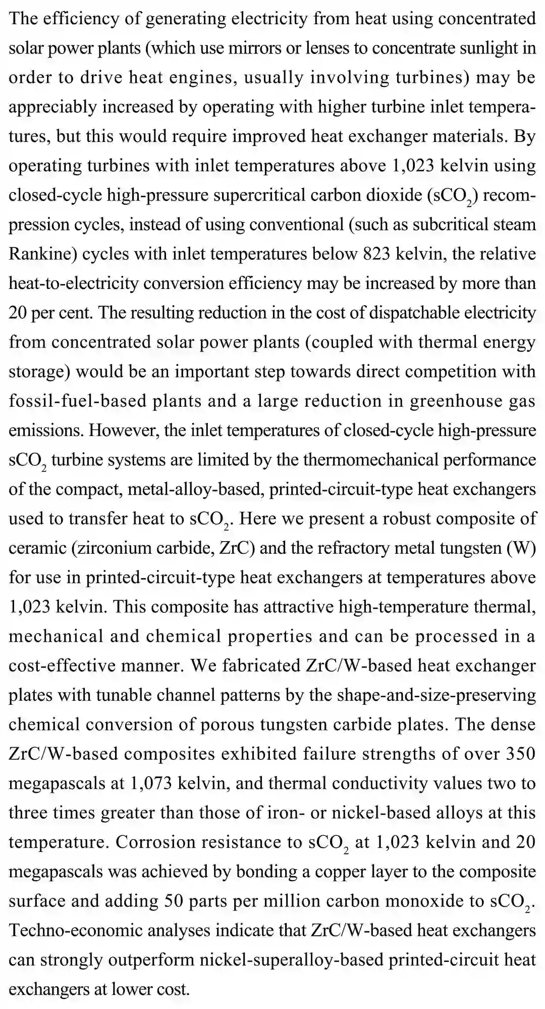 (导读 阿金)使用太阳能集中发电时,增加涡轮进口温度,可有效提高热能发电效率,因此改善热交换材料是关键。本研究报道一种稳健的陶瓷(ZrC)-金属(W)复合材料,可保证打印回路型热交换器在1023 K高温下正常运行,并保持优异的热学、力学和化学性能,同时具备抗sCO2腐蚀性能。表明该材料比Ni基超级合金具有更大的优势。