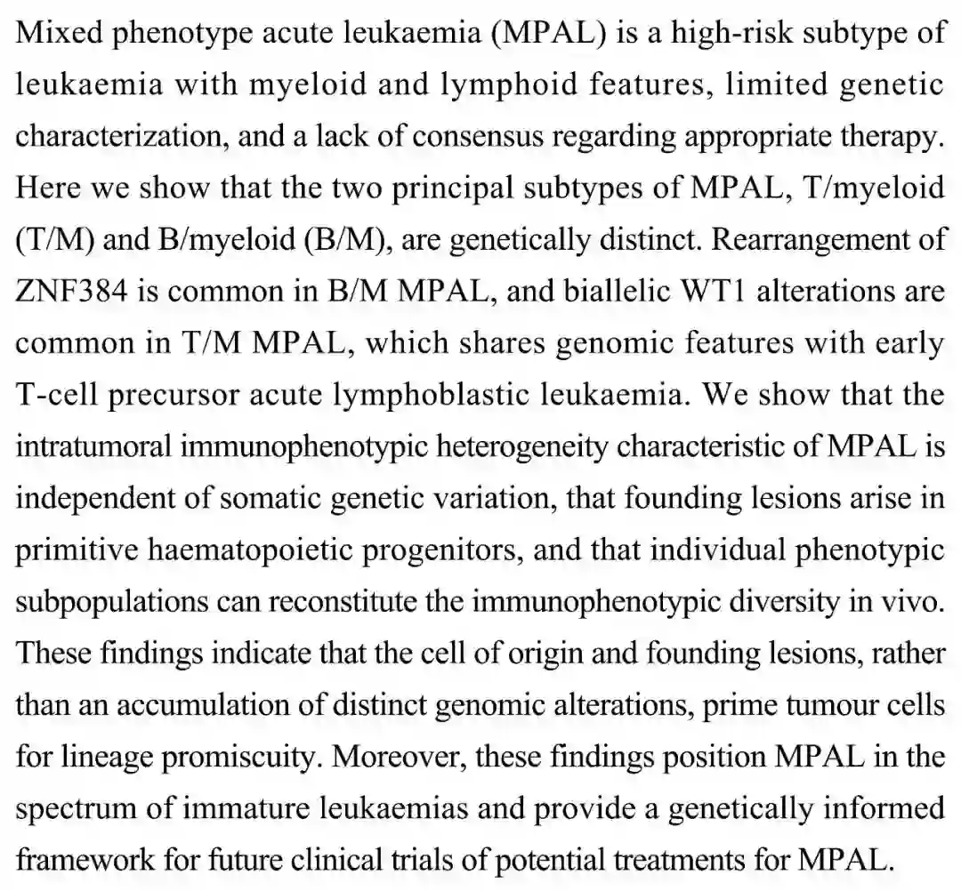 (导读 郭怿暄)混合表型急性白血病(MPAL)是一种兼具髓系和淋巴系特征的高危白血病亚型,尚缺乏深入研究和治疗手段。本研究发现MPAL两种主要亚型:T/髓系(T/M)及B/髓系(B/M),两者具有显著的遗传差异。ZNF384重排常见于B/M MPAL,而双等位基因WT1改变常见于T/M MPAL。MPAL肿瘤内免疫表型异质性来源于原始的造血祖细胞,而非体细胞遗传变异。该发现为寻找MPAL的有效治疗奠定基础。