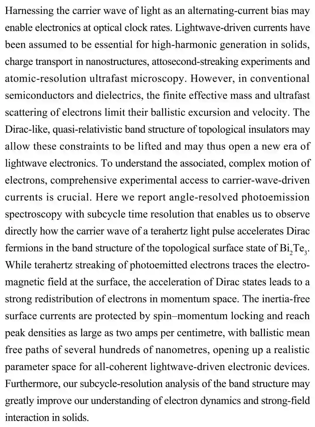 (导读 阿金)拓扑绝缘体中的类狄拉克准相对论能带结构可扫除传统半导体和电介质的局限,开启光波电子学的新时代。本研究报道具有子循环时间分辨率的角分辨率光电子能谱可直接观测太赫兹光脉冲载波对Bi2Te3拓扑表面态能带结构中狄拉克费米子的加速过程。观测结果为全相干光波驱动电子器件开辟一个真实的参数空间,有助于深入了解固体中电子动力学和强场相互作用。