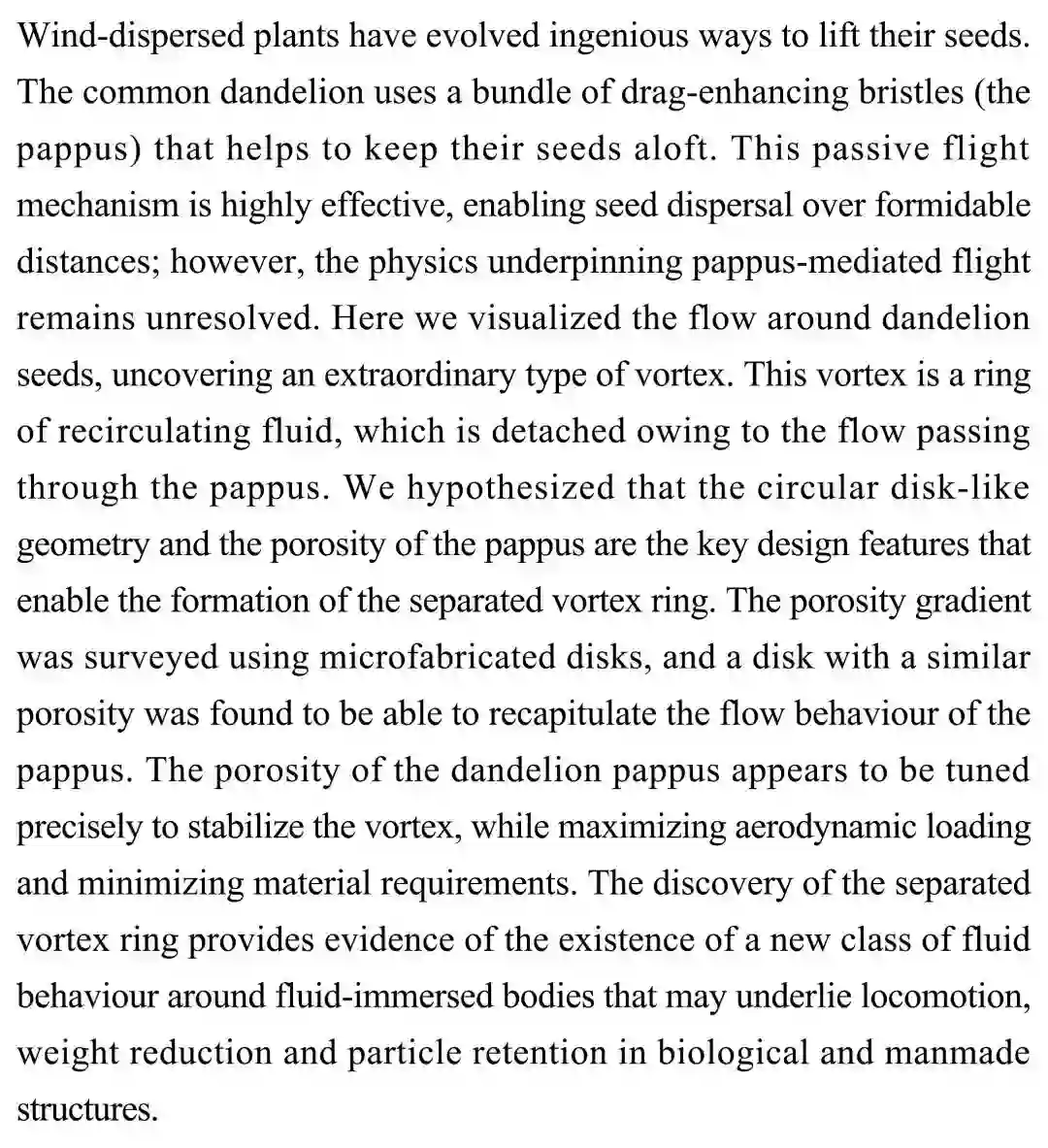 (导读 阿金)蒲公英利用冠毛借助风力帮助种子飞行进行扩散。本研究发现蒲公英冠毛周围一个分离且稳定的循环气流涡环,其圆盘状结构和冠毛的孔隙度是导致分离的关键因素。而冠毛孔隙度受到精确调控以稳定涡环,实现空气动力负荷最大化、材料要求最小化。该发现为研究生物结构、改善人造结构中的运动、重量减轻和颗粒俘获提供新思路。