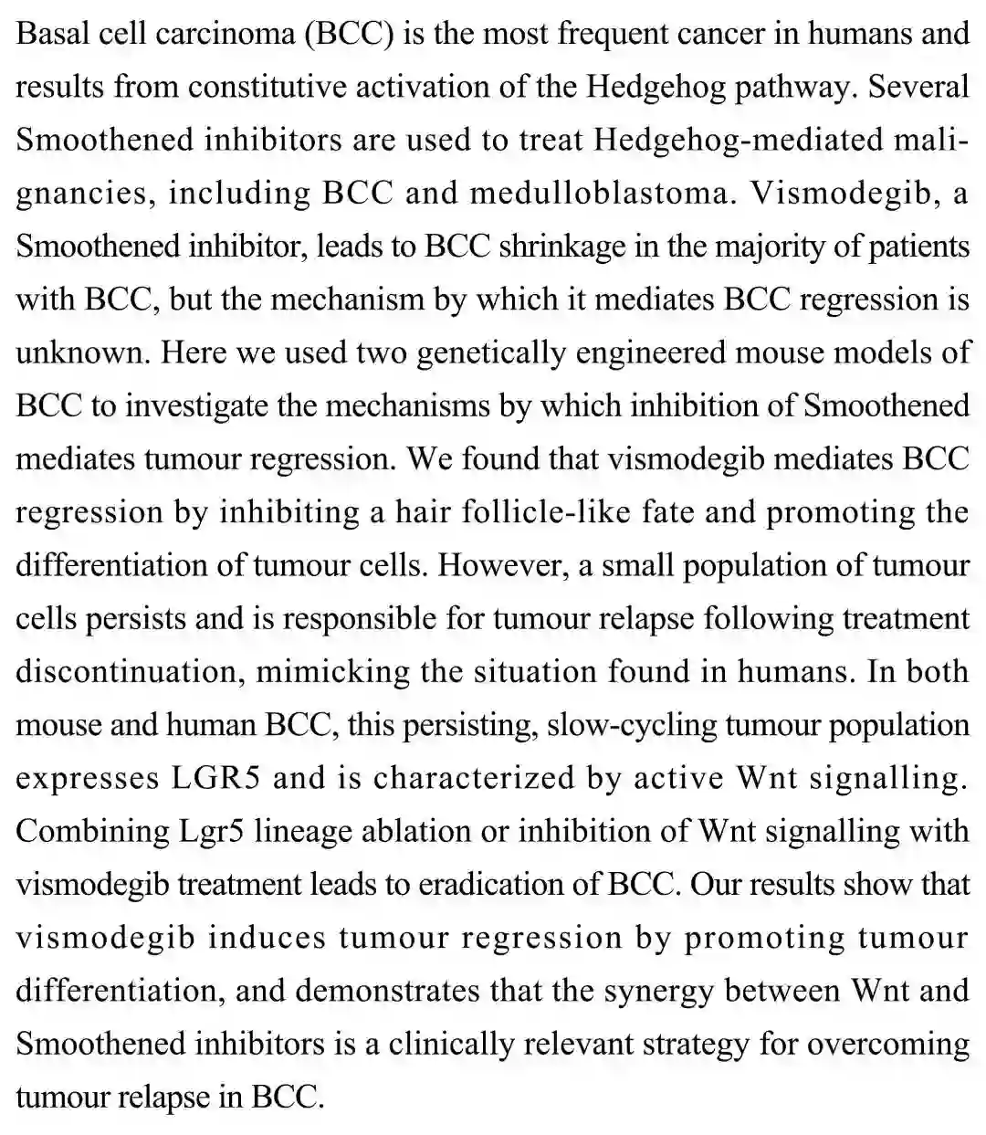 (导读 阿金)Vismodegib作为Smoothened抑制剂用于治疗基底细胞癌(BCC),但尚不清楚其作用机制。本研究使用基因工程BCC小鼠发现vismodegib通过抑制毛囊样细胞命运和促进肿瘤细胞分化介导BCC消退,但在治疗后一群表达LGR5,wnt信号通路激活的慢速更新肿瘤细胞持续存在导致肿瘤复发。将去除Lgr5细胞或抑制Wnt信号与vismodegib治疗结合可根除BCC。该研究结果为抑制BCC复发提出了一种组合治疗策略。