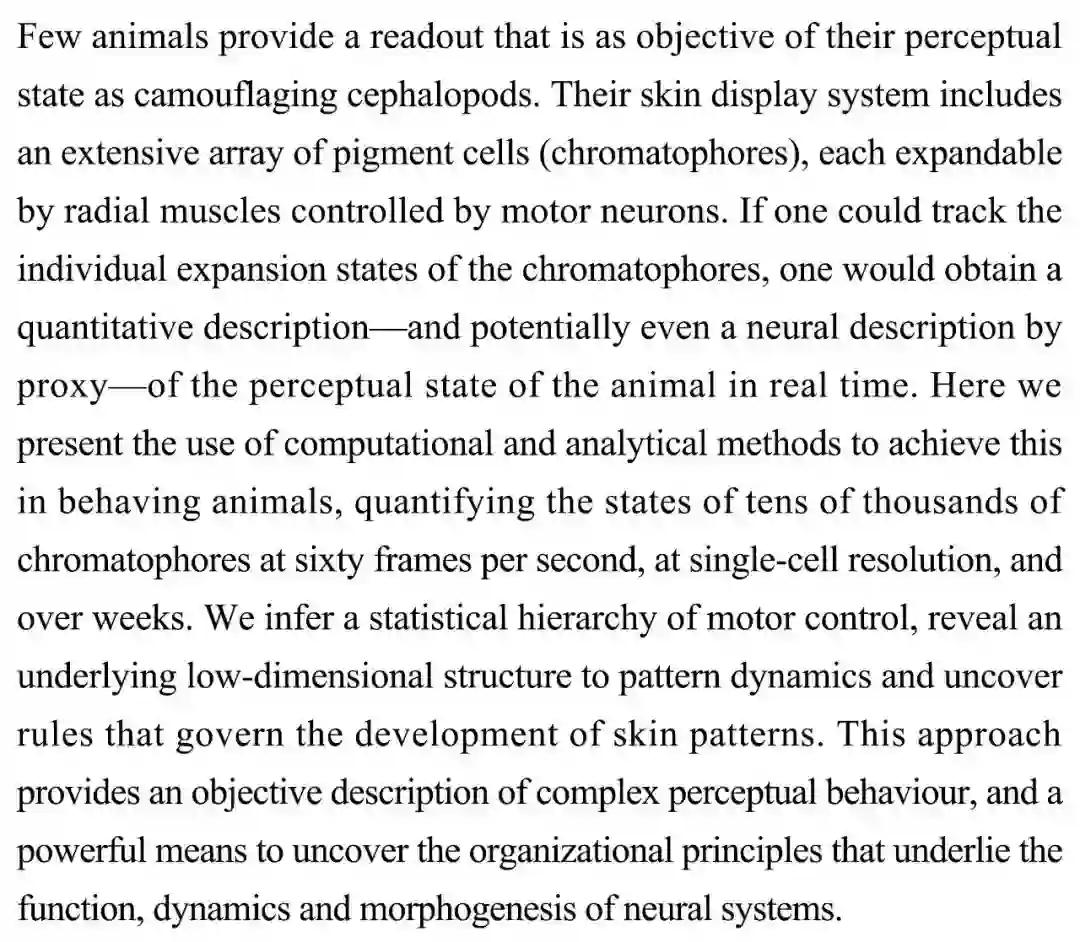 (导读 王思菲)通过运动神经元控制放射状肌肉的收缩,头足纲动物皮肤上的色素细胞可形成不同图案进行自我伪装。本研究应用计算和分析方法以每秒60帧的频率对数万个色素细胞的状态进行长达数周的单细胞分辨率量化分析,揭示了图案动态变化的低维结构和控制皮肤图案的规则。此方法为复杂感知行为提供了客观描述,并揭示神经系统功能、动态变化和形态发生背后的组织原则。