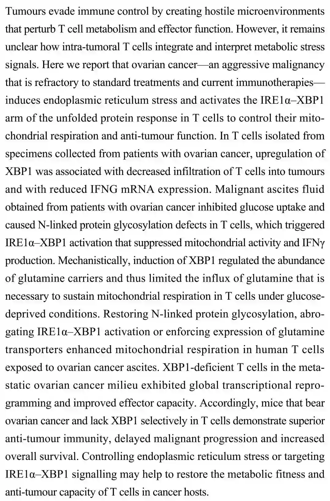 (导读 王思菲)肿瘤微环境影响T细胞代谢和效应功能,但肿瘤浸润T细胞如何整合和应对代谢应激信号仍未知。本研究发现标准治疗无效,正进行免疫治疗的卵巢癌可诱导内质网应激并激活T细胞中IRE1-XBP1,导致未折叠蛋白应答,从而控制线粒体呼吸作用和抗肿瘤功能。卵巢癌小鼠中特异性敲除T细胞XBP1使其抗肿瘤免疫更强,延迟肿瘤恶性进展并提高存活率。
