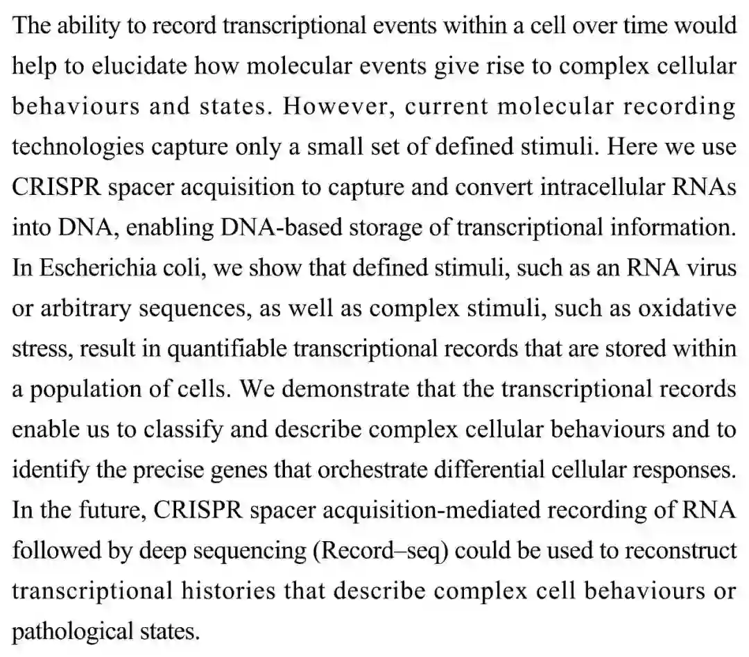 (导读 过泽远)在细胞内记录转录事件有助于阐明胞内分子如何引起复杂的细胞的行为和状态。本文使用CRISPR间隔物捕获胞内RNA并转换为DNA,用于存储转录信息。在大肠杆菌中通过一个确立的刺激,可产生储存在细胞群中的可量化的转录记录。通过CRISPR间隔物可以重建描述复杂的细胞行为或病理状态的转录记录。