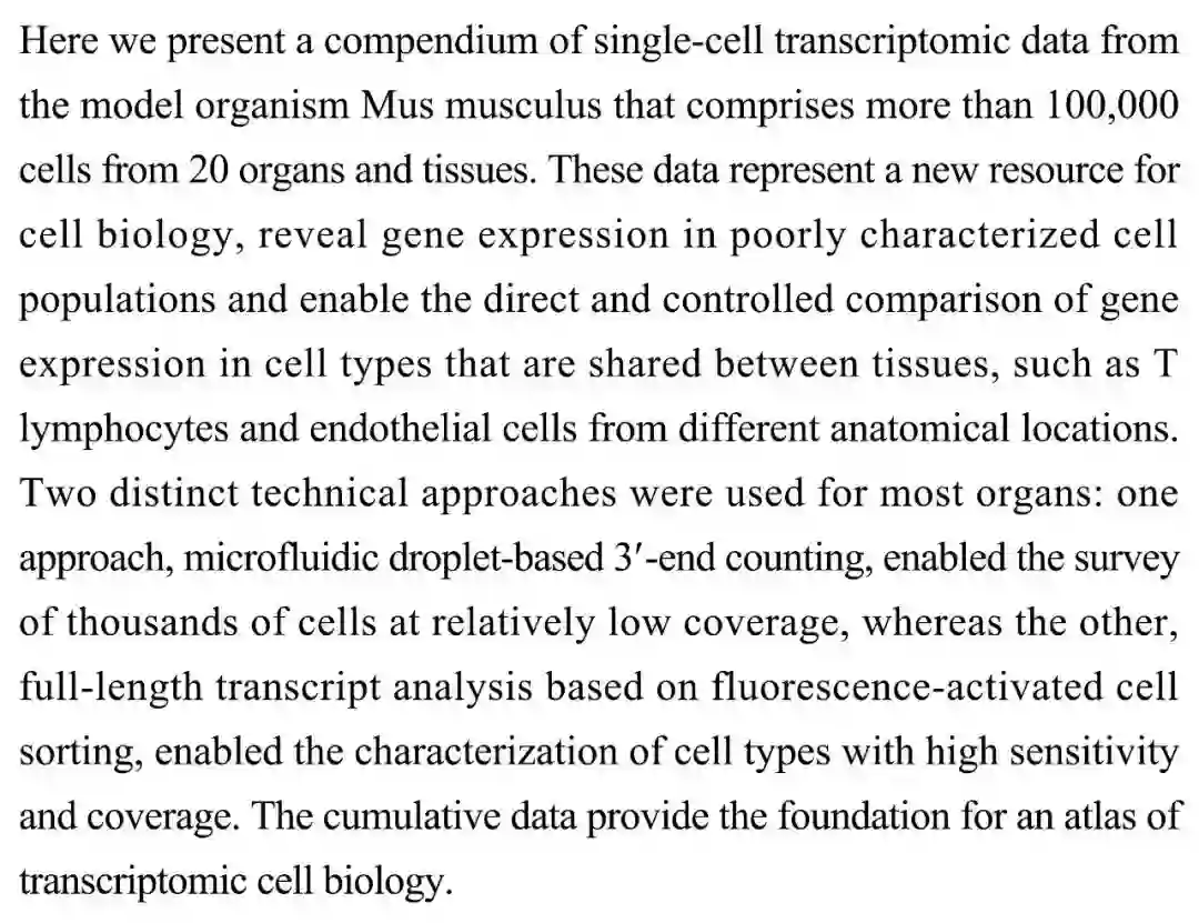 (导读 郭怿暄)本研究对来自小鼠20个组织器官的10万多个细胞进行单细胞测序建立了Tabula Muris数据库。测序应用两种方法:高通量、低覆盖的基于微流体液滴的3‘端计数以及高灵敏度和覆盖率的基于荧光激活细胞分选的全长转录分析。该数据库资源可用于研究罕见细胞的基因表达,不同组织间同类型细胞基因表达的比较,为绘制细胞生物学的转录图谱奠定基础。