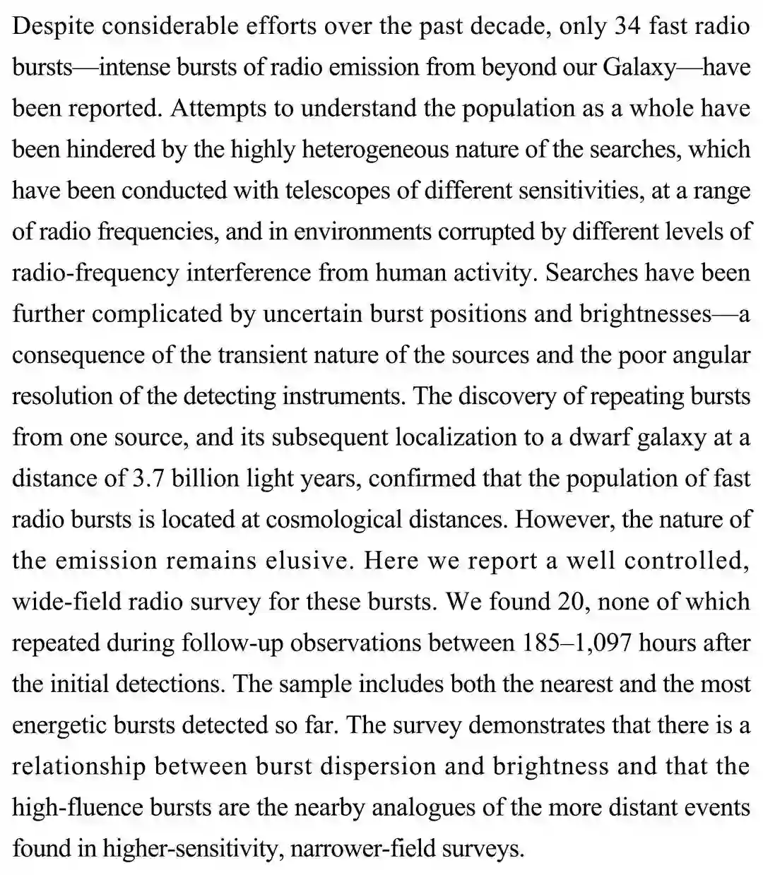 (导读 雷鸣)过去10年报道过的快速射电暴(FRB)只有34次,因爆炸位置和亮度的不确定性,使得搜寻工作愈加复杂。本研究对FRB进行了控制良好的广域探测,发现20次FRB,在观测后185 - 1097小时后均没有重复发生,其中包括迄今距离地球最近及爆炸能量最高的两次FRB。研究表明,FRB色散和亮度之间存在一定关系,高通量暴发与在高灵敏度、狭域探测中发现的远距FRB相似。
