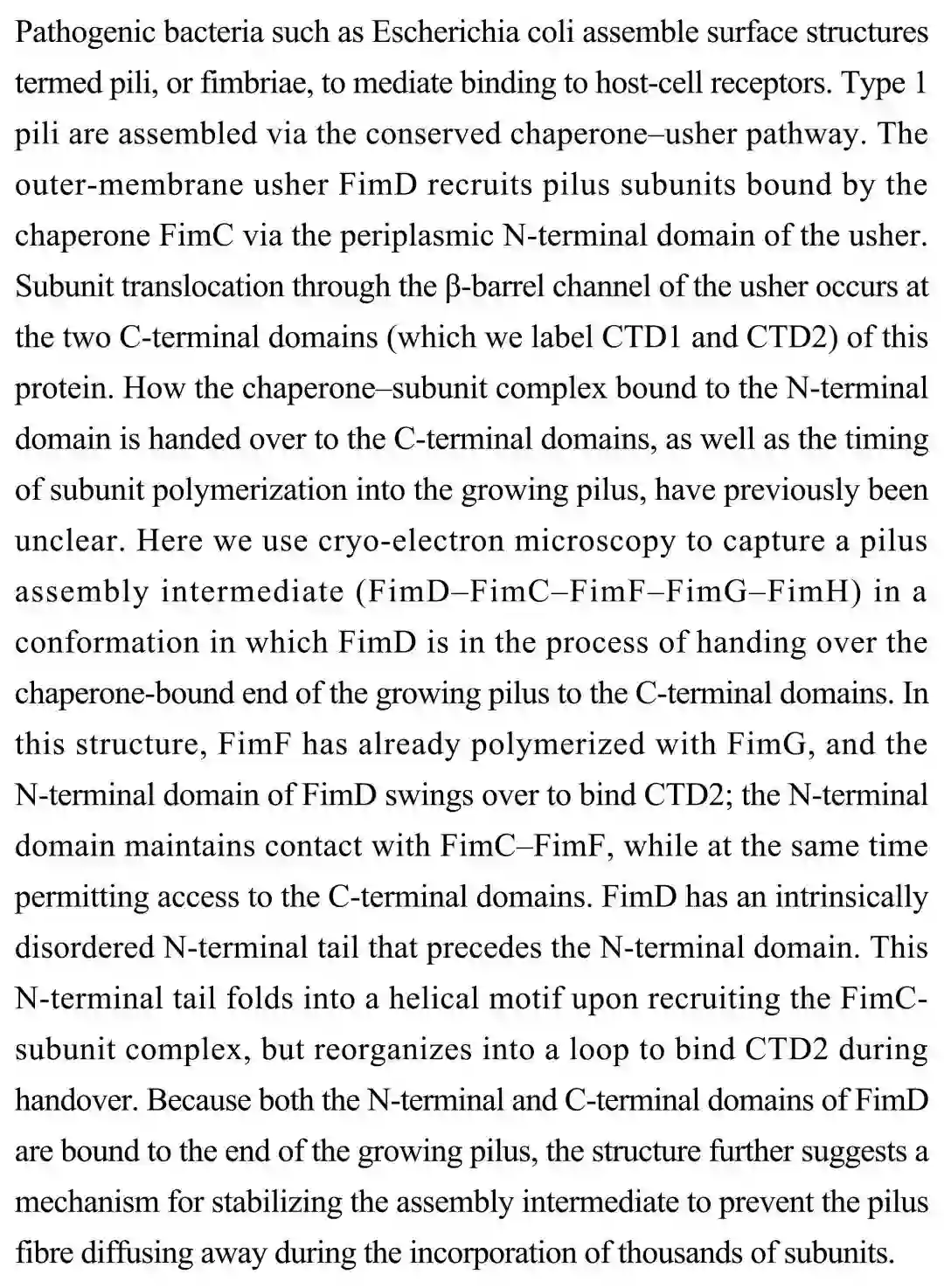 (导读 郭思瑶)细菌1型菌毛组装过程中,与分子伴侣FimC结合的菌毛亚单位首先与细胞外膜上引领蛋白FimD位于周质侧的N端结构域结合,再被转移到FimD的C端结构域,并组装为菌毛。研究者利用冷冻电镜捕获了大肠杆菌菌毛组装中间体FimD–FimC–FimF–FimG–FimH的结构,该中间体结构展示了各亚基由FimD N端转移至C端,并逐渐组装为多聚体的一个时间节点,揭示了各亚基转移和组装的分子机制。