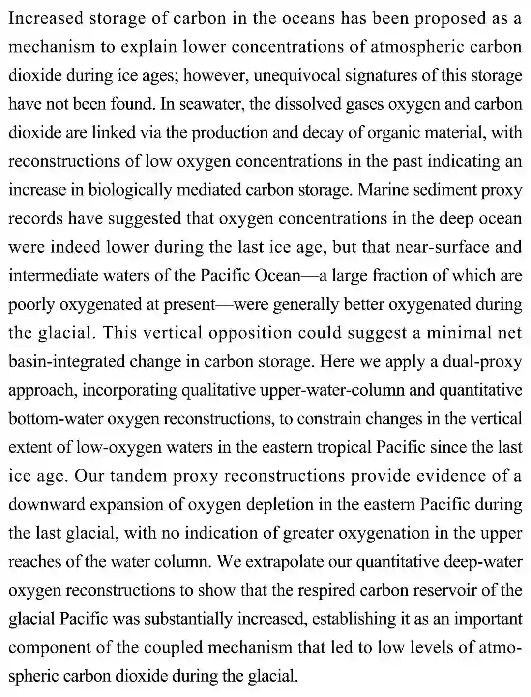 (导读 阿金)海洋碳储量的增加是解释冰期大气二氧化碳浓度降低的机制。本研究使用双重代理法,结合定性上层水体和定量下层水氧重构,证据表明上一次冰期太平洋东部的氧消耗向下扩张,同时没有迹象表明水体上层氧化更强。结果说明冰期太平洋呼吸性碳储存明显增加,导致当时大气二氧化碳含量较低。
