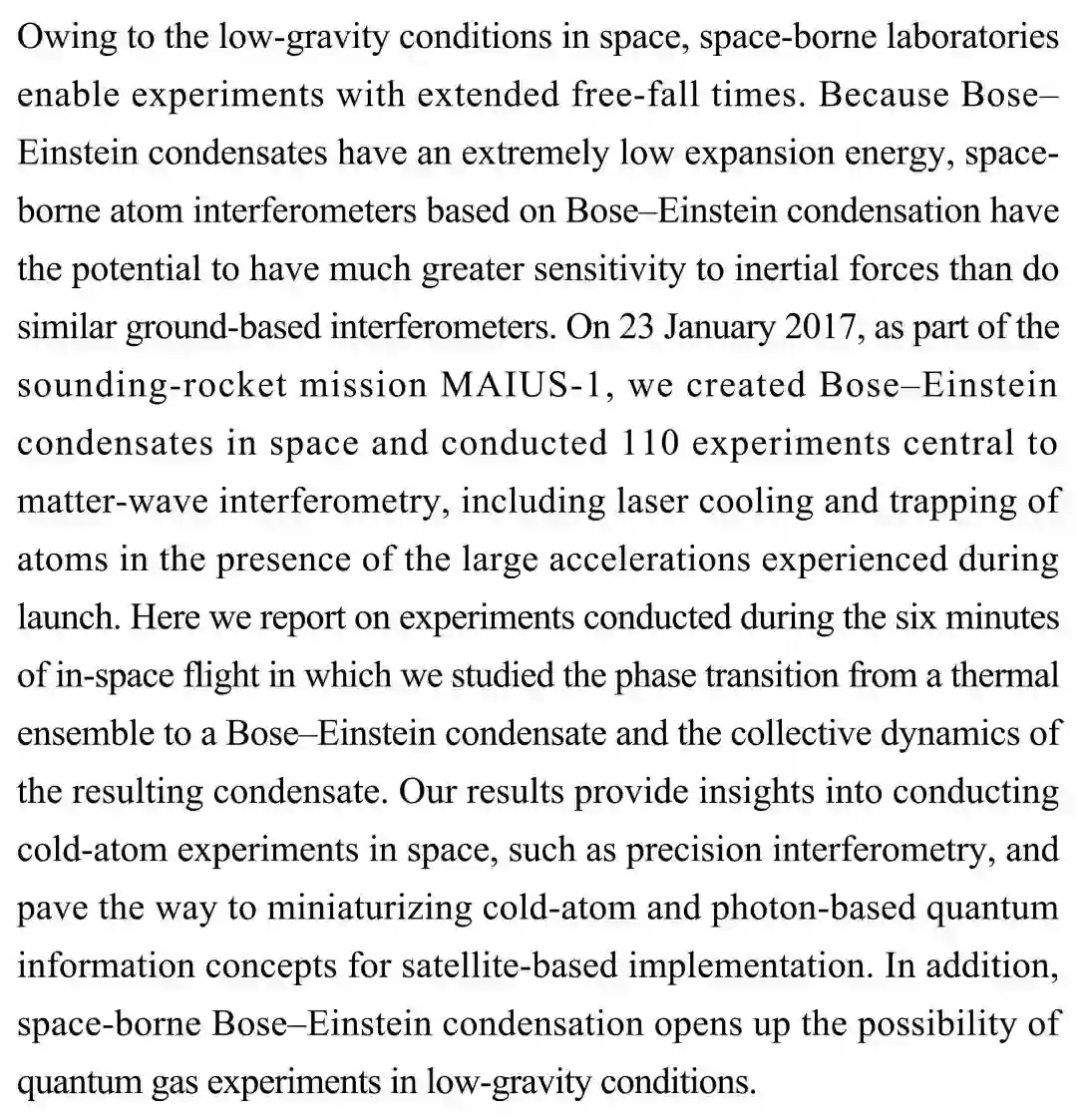 (导读 阿金)由于玻色-爱因斯坦凝聚体的极低膨胀能量,基于此建造的太空原子干涉仪可提供对惯性力更高的敏感度。本研究报道探空火箭在太空飞行的六分钟期间展开的有关波色爱因斯坦凝聚的一系列实验,研究了从热集合到玻色-爱因斯坦凝聚体的相变和凝聚体的集体动力学。研究结果为在太空中开展冷原子实验提供新思路,并为在低重力条件下进行量子气体实验铺平道路。